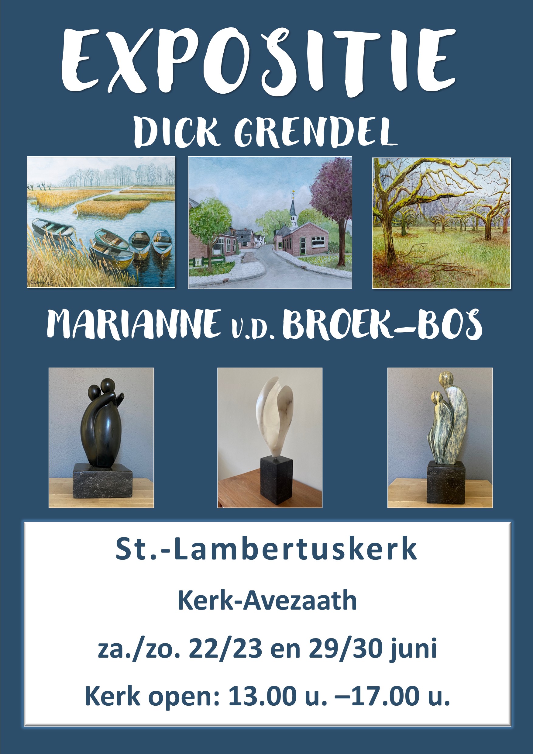 2024 Expositie 29 en 30 juni Dick Grendel en Marianne van den Broek-Bos in de St. Lambertuskerk te Kerk-Avezaath en 13 en 14 juli deelname Kunst en Brocante markt “Vive la France” te Hummelo.